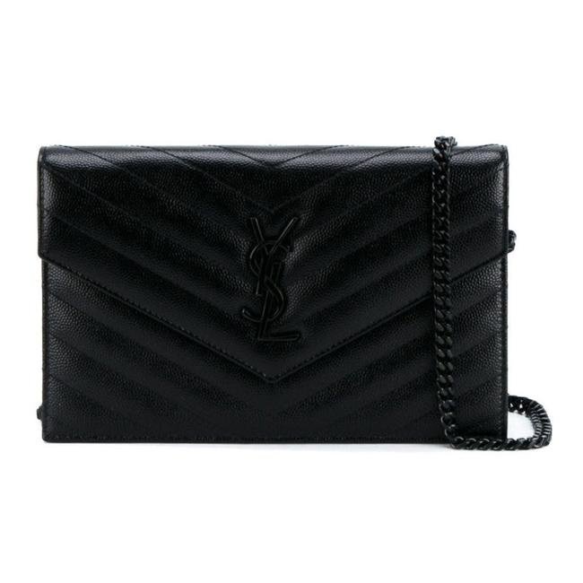 We guarantee this is an authentic SAINT LAURENT Grain De Poudre Matelasse Chevron Monogram Chain Wallet Black or 100% of your money back. This elegant chain wallet features fine pebbled chevron quilted leather in black. The bag features a black chain link shoulder strap and a facing V- shaped flap with a prominent black YSL logo. The flap opens to a partitioned black leather interior with card slot panels, patch pockets, and a zipper divider.
