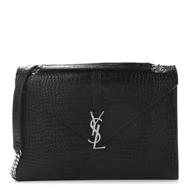We guarantee this is an authentic SAINT LAURENT Calfskin Crocodile Embossed Monogram Large Satchel or 100% of your money back. This stylish shoulder bag is crafted of fine textured leather in black. The bag features a silver chain link shoulder strap with a silver YSL logo on the face. This structured bag opens to a black fabric interior with a small patch pocket. This is the ideal shoulder bag for day or evening wear, from Saint Laurent!