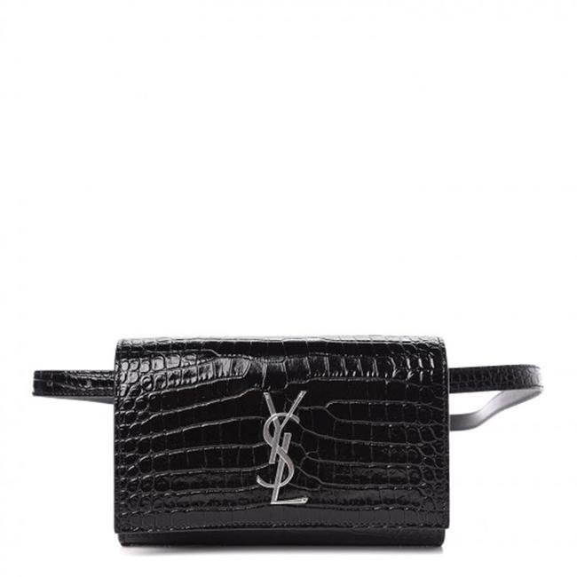 We guarantee this is an authentic SAINT LAURENT Calfskin Crocodile Embossed Monogram Kate Belt Bag Black or 100% of your money back. This chic belt bag is crafted of embossed calfskin leather in black. It features an adjustable belt strap and silver hardware. The top zipper opens to a compact black interior with zipper and patch pockets. This is a chic bag for day or evening with the classic style of Saint Laurent!