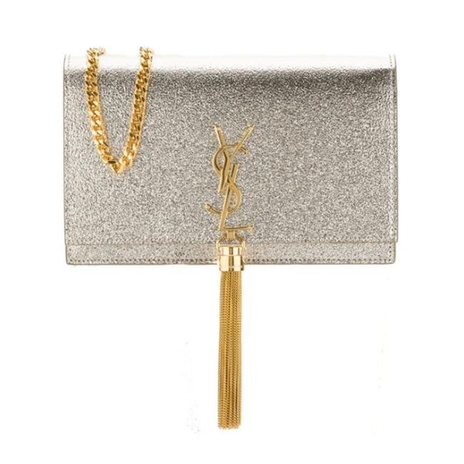 This is an authentic SAINT LAURENT Kate Monogram Tassel Chain Wallet in Pale Gold. This is a stylish metallic YSL handbag for day or night. It features a pale gold textured grainy metallic calfskin leather canvas, a flap top, an interlocking YSL monogram, gold-tone metal hardware, a metal tassel detail, and a detachable chain shoulder strap. The interior a leather lining with a zip coin pocket, six card slots, a bill slot, spaces for notes, and a snap magnetic closure. This surely is a must-have! Made in Italy.