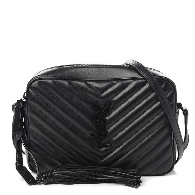 We guarantee this is an authentic SAINT LAURENT Calfskin Matelasse Monogram Lou Camera Bag Black or 100% of your money back. This chic shoulder bag is crafted of chevron-quilted calfskin leather in black. It features an adjustable crossbody strap with a removable tassel and polished black hardware including a prominent YSL monogram detail on the front. The top zipper opens to a compact black fabric interior with a patch pocket.