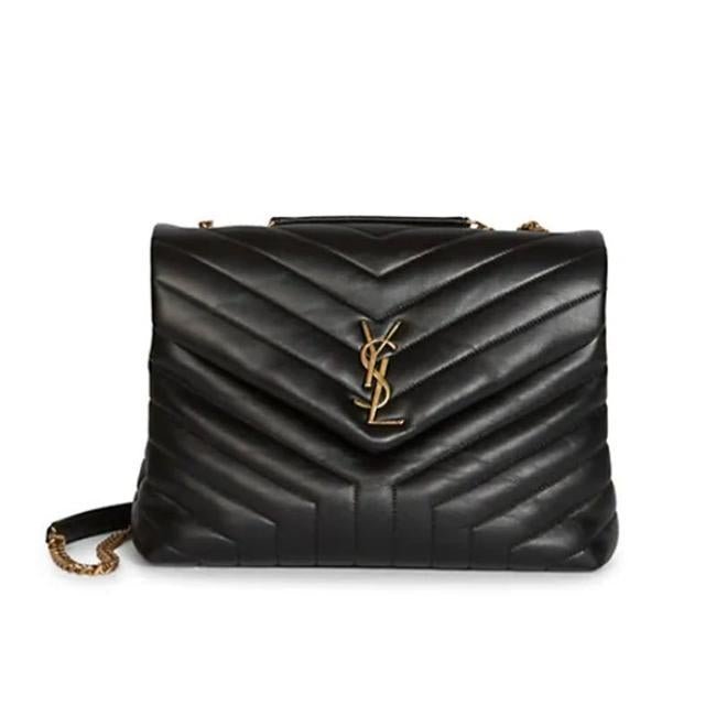 We guarantee this is an authentic SAINT LAURENT Calfskin Y Quilted Monogram Medium Loulou Chain Satchel Black or 100% of your money back. This elegant shoulder tote is crafted of chevron-quilted calfskin leather in black. The bag has aged brass chain-link shoulder straps with black leather shoulder pads. The envelope-style crossover flap features a prominent aged brass YSL monogram detail and snaps open to a partitioned black fabric interior with zipper pockets. This is an ideal bag for day or evening wear, with the timeless appeal of Yves Saint Laurent!