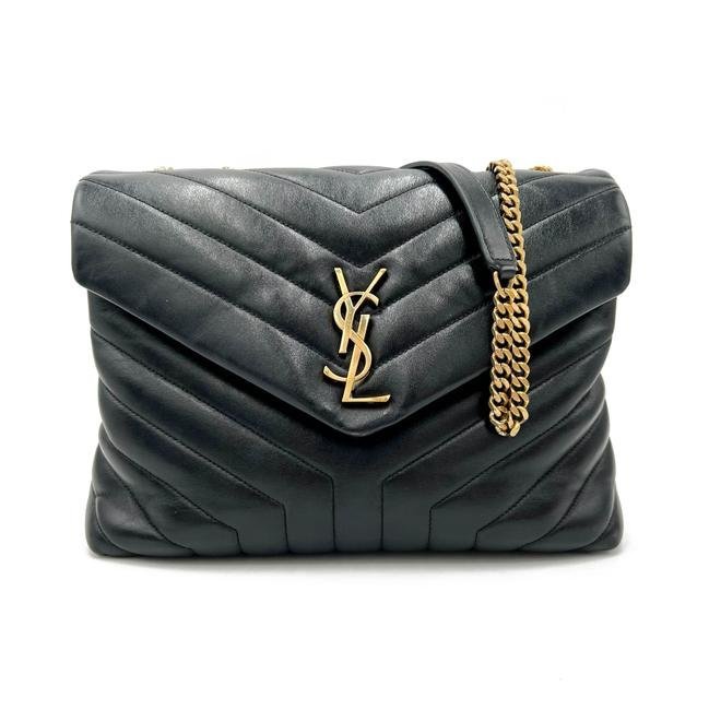 We guarantee this is an authentic SAINT LAURENT Calfskin Y Quilted Monogram Medium Loulou Chain Satchel Black or 100% of your money back. This elegant shoulder tote features chevron quilted calfskin leather in black. The bag has an aged gold chain link shoulder straps with black leather shoulder pads. The envelope-style crossover flap features a prominent aged gold YSL monogram detail and snaps open to a partitioned black fabric interior with zipper pockets.