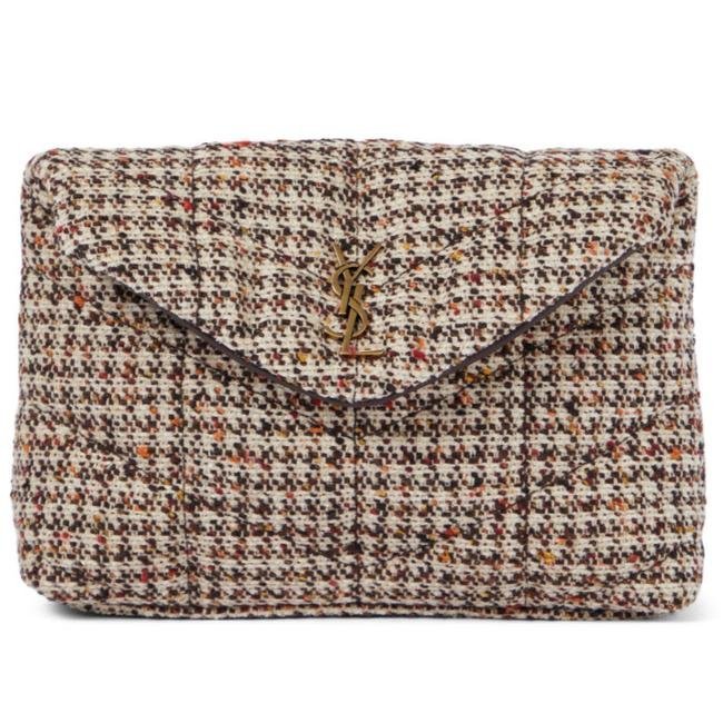 Saint Laurent revisits its Loulou clutch in a multicolored tweed. Padded and quilted with a chevron effect, it has burnished golden hardware with a flap top and internal slots. It comes with an additional brown leather cardholder.