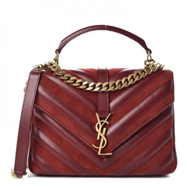 We guarantee this is an authentic SAINT LAURENT Calfskin Suede Matelasse Chevron Medium Monogram College Bag Burgundy or 100% of your money back. This elegant shoulder tote features chic burgundy chevron quilting at both the front and the back with leather and suede pattern with smooth leather sides. The bag features a rear pocket, an aged gold chain link shoulder strap with a matching leather shoulder pad. The frontal flap features a prominent aged gold tone YSL monogram detail and opens to a partitioned fabric interior with a zippered pocket. This is an ideal bag for your collection for day or evening, with the classic chic only from Yves Saint Laurent!